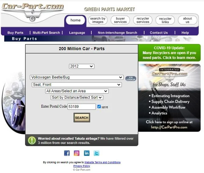 The donor seat came out of a 2012-2015 VW Beetle. This seat contains the correct Air Bag Presence Module (part #5C6 959 339) as well as the correct Occupancy Sensor Mat (part # 5C5959337) and harness connectors for the air bag resistor. I have found that the website https://www.car-part.com/ is a great place to look for used parts. The search screen and results are shown in the images below. I found that the option selected for the Right Hand (Passenger seat for those of us with left hand drive cars) was the most affordable option and can be had for about $100 for the complete seat. This is key because the sensor mat is not easy to source in the US.